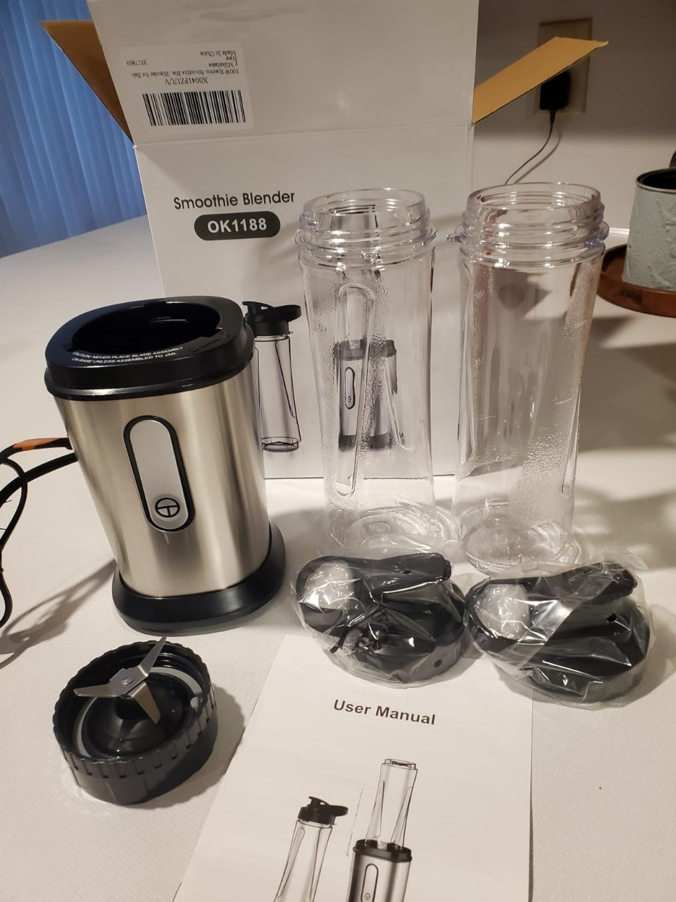 You get the main blender base, two 20oz BPA-free bottles, two leak-proof carrying lids, removable blade assembly, and a user manual. Everything you need to get started